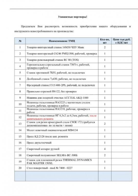 ООО "РМЗ" продает невостребованное оборудование.
