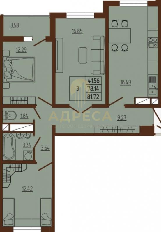 81.72 м2, 3-комн. квартира, 3 этаж из 11