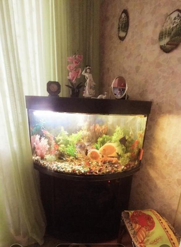 Угловой аквариум с тумбочкой, крупными рыбками- Северум, Скалярии, Боции- 11 штук, погружными ламп